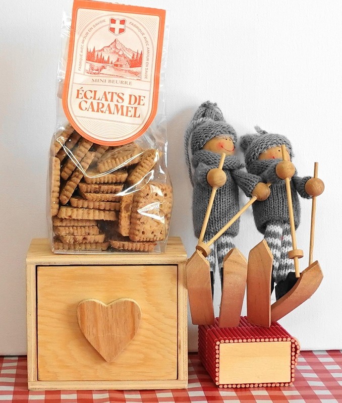Composition : farine blé, beurre, sucre, éclats caramel 13%, jaune et blanc oeuf, lait en poudre entier